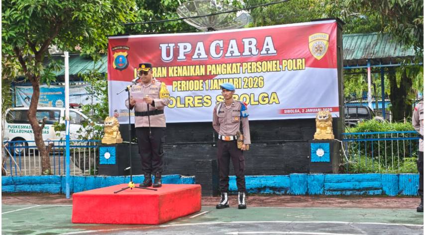 SIBOLGA — Kepolisian Resor (Polres) Sibolga melaksanakan Upacara Kenaikan Pangkat Personel Polri periode 1 Januari 2026 pada Jumat, 2 Januari 2026, pukul 08.00 WIB. Kegiatan berlangsung khidmat bertempat di Lapangan Satuan Lalu Lintas Polres Sibolga dan diikuti oleh seluruh jajaran Polres Sibolga.
